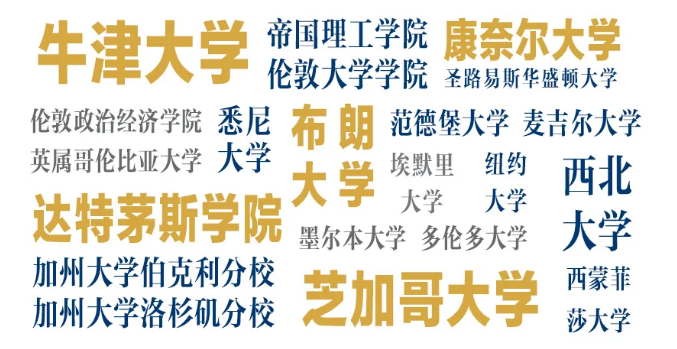 根据USNews、QS、TIMES等权威机构排名,近四年(2018-2021)学生获得世界排名前50、美国排名前50、英国排名前10名校录取占比分别为84.9%、82.3%、86.3%、88.8%,录取学校包括但不限于: