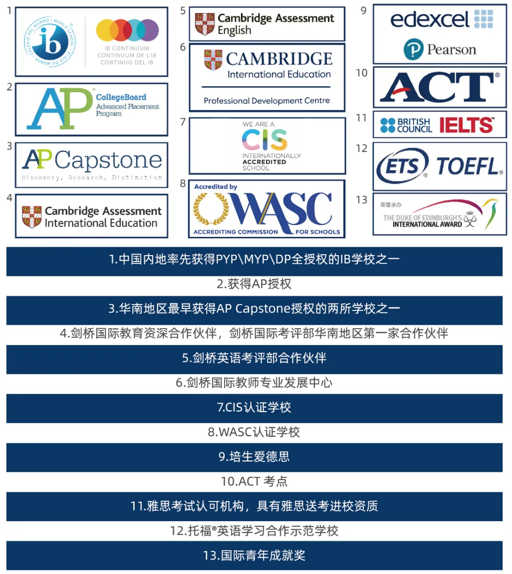 学校通过多项国际权威认证,学生学历获全球高校广泛认可,为升学之路奠定坚实基础。广碧是中国最早的全学段IB世界学校之一,是华南地区第一家剑桥合作伙伴,是华南地区最早获得AP Capstone授权的两所学校之一。学校已获得十三项国际认证或授权,包括被誉为国际学校评估领域“奥斯卡”的CIS和WASC。