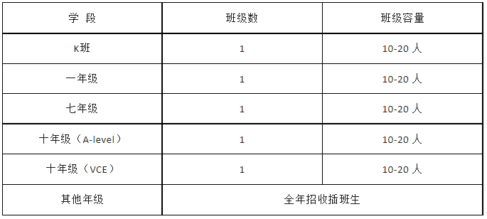 学校招收外籍、港澳台及持有外国长居身份的K班(5-6岁)及1-12年级学生,1-6年级为小学,7-9年级为初中,10-12年级为高中。如不清楚是否符合招生条件,请向招生老师咨询。