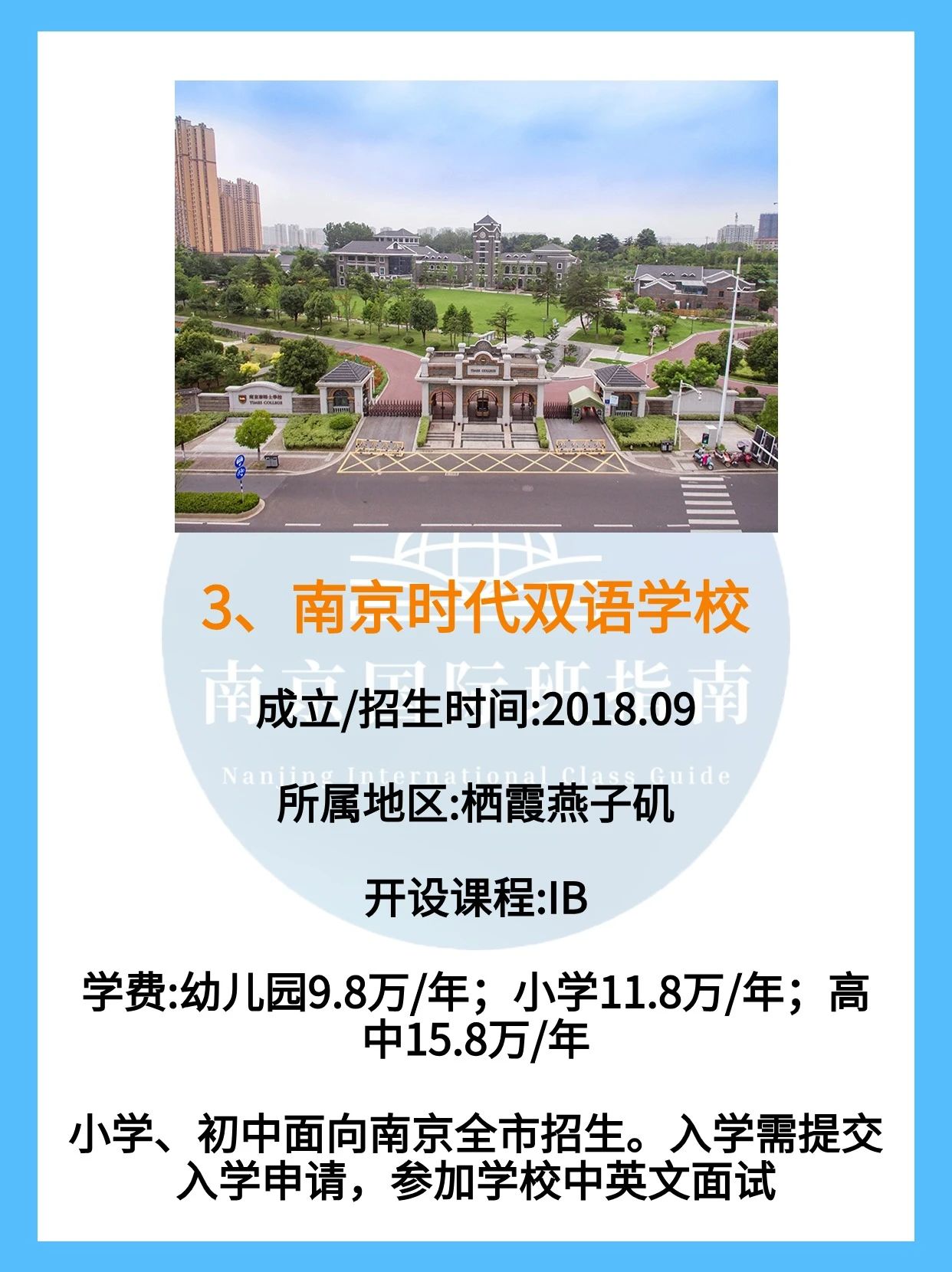 南京时代双语(原泰晤士)学校于2018年9月作为南京市重点项目创校开学,是座落于南京燕子矶新城,从幼儿园到高中的十五年一贯制双语学校。学校先后获得IB世界成员学校、剑桥国际成员学校、NCC教育成员学校、万物启蒙实验联盟校等权威认证,并成为厦门大学及华东师范大学研究生实践基地。