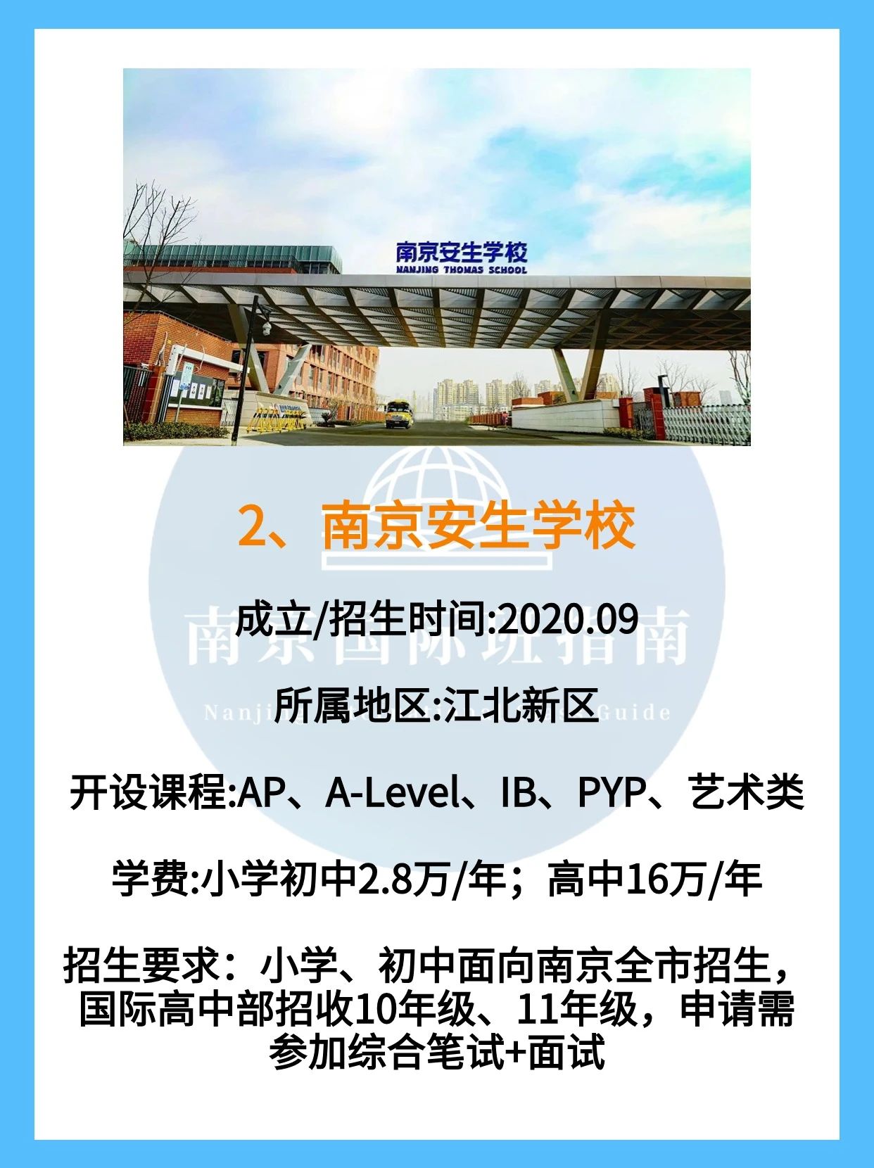 南京安生学校(原南京托马斯实验学校)是由中国国际化教育的探索者——上海安生教育集团创办,并由美国托马斯•杰弗逊科技高中、英国剑桥大学、美国斯坦福大学教育教学资源以及素有“学前教育哈佛”之称的美国高瞻学前教育资源共同参与建设的办学特色鲜明的一所15年一贯制高端民办国际化融合学校,学段覆盖幼儿园、小学、初中和高中(国际高中和普高两个方向)。南京安生学校引进并融入STEM/STEAM课程、IBET课程、安生国际艺术人才培养项目,努力探索中国基础教育融合创新之路,为培养学生具备国际视野和“行走天下”的能力奠定雄厚基础。