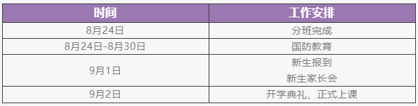 报到流程:南门签到→打卡→家长会(紫水晶09:30-10:30)→班级报到提交资料(11:30前 201-204教室)→寝室整理