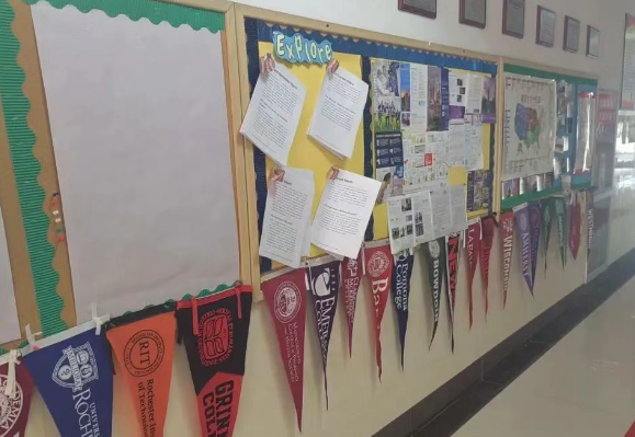 杭外剑高的教学楼走廊里的海报和同学们的作品展示;走廊里一排排柜子,方便同学们放置个人物品。还有同学们常去的图书馆和运动馆。