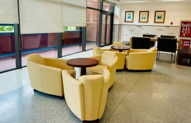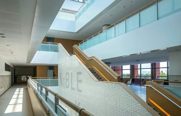一层主要设置了艺术教室等功能教室,在大厅的中心位置展示了学生的升学录取情况和取得的各项荣誉。学生教室主要集中在二三层;教学楼的四楼主要是教师办公室、阅览室和开放式休息区,大家可以在课后时间来看书或者交流答疑。