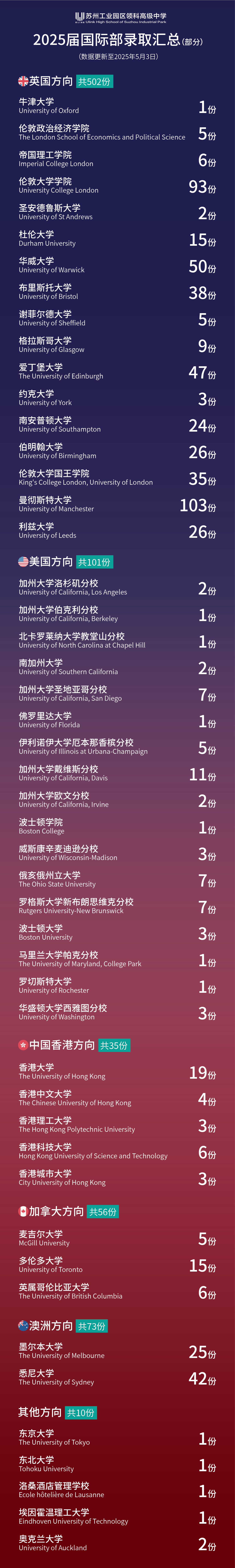 截止当前,苏州领科2025届国际部169名毕业生共收获近800份预录取,人均近5份(预)录取通知书,覆盖多个国家及地区。其中: