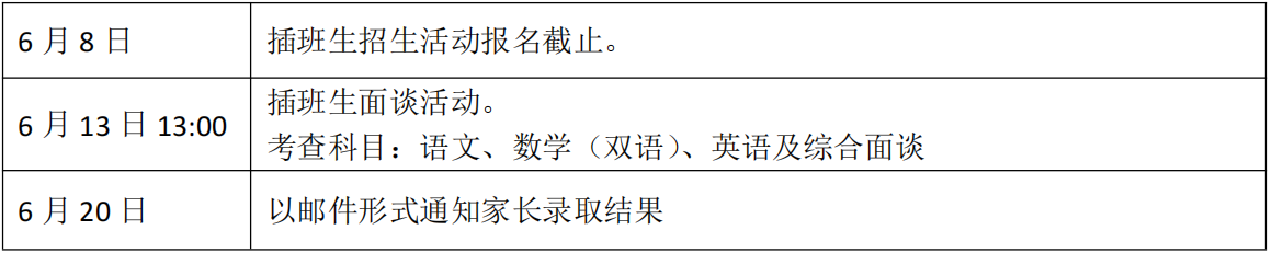 2025学年第一学期插班生学额较为紧张,部分年级学额已满。如申请入读的年级有空缺学额,老师将通过邮件形式通知家长面谈活动具体时间安排,并请准备相关资料。