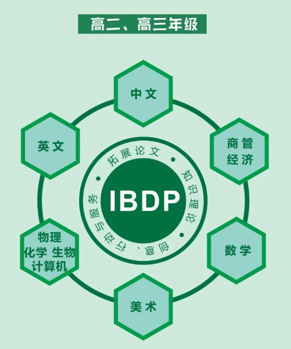 开设IBDP国际文凭课程。遵循IBDP统一教学大纲,按照IBDP课程要求,学生选读母语、母语以外的第二外语、个人与社会研究、科学、数学及艺术六个组别中的6门课程,同时必修知识理论TOK、拓展论文EE以及社会实践CAS三门核心课程。学校同时加开升学指导课程及托福、雅思、SAT等语言培训课程。