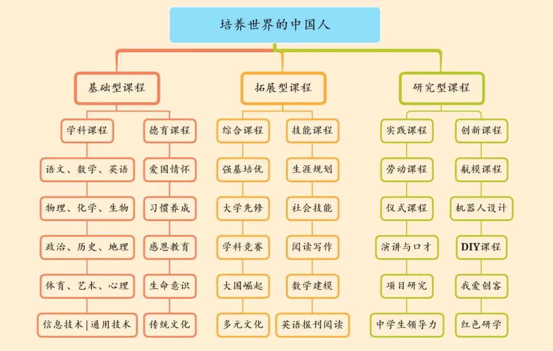 郑中国际学校高中部的课程体系建设在十二年一贯制课程规划的基础上,充分考量学生终身学习与发展所必备的基础知识、核心素养、基础技能和关键能力的综合提升,满足不同层次学生的发展需求,关注学生的学习兴趣和特长,为学生的终身发展和终身幸福奠基,共建设三类六种课程,分别为基础型课程(学科课程、德育课程)、拓展型课程(综合课程、技能课程)和研究型课程(实践课程、创新课程)。