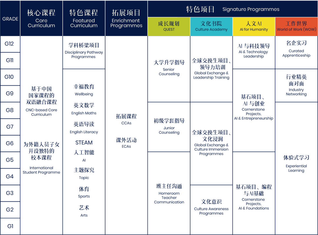 学校的核心课程以国家课程为基础,帮助学生构筑坚实的学术基石,发展优秀的双语双文能力,升学海外顶尖学府。