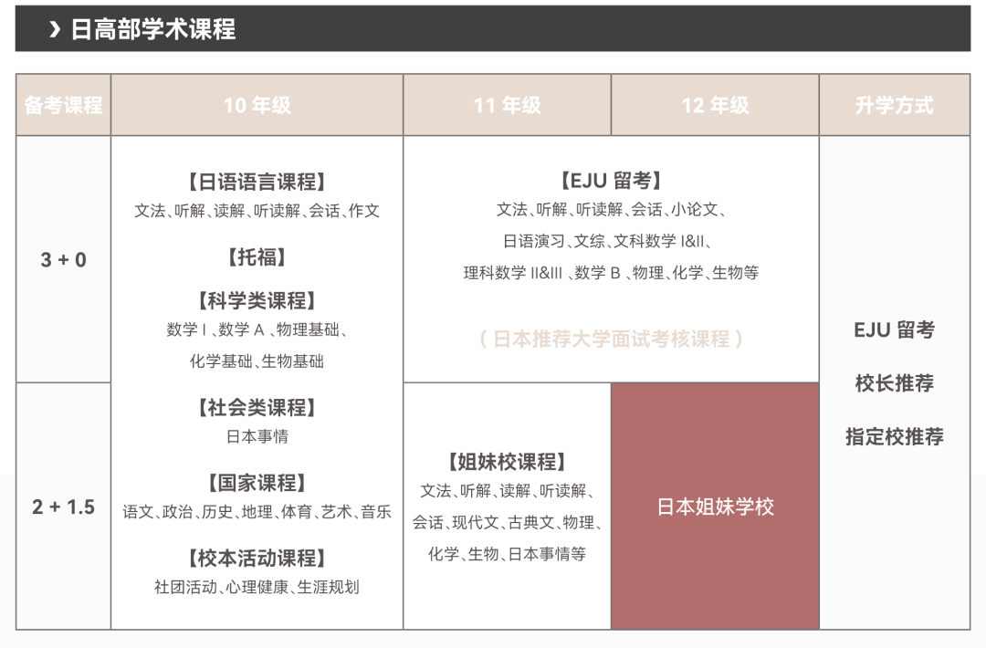 学制方面创新性地开设了“3+0”和“2+1.5”的多元化升学通道。选择2+1.5学制的学生在完成2年的国内课程后,有20余所日本姐妹高中可供选择,为保证升学质量,其中70%的姐妹高中为独家合作关系,是业内的No.1。>>>>