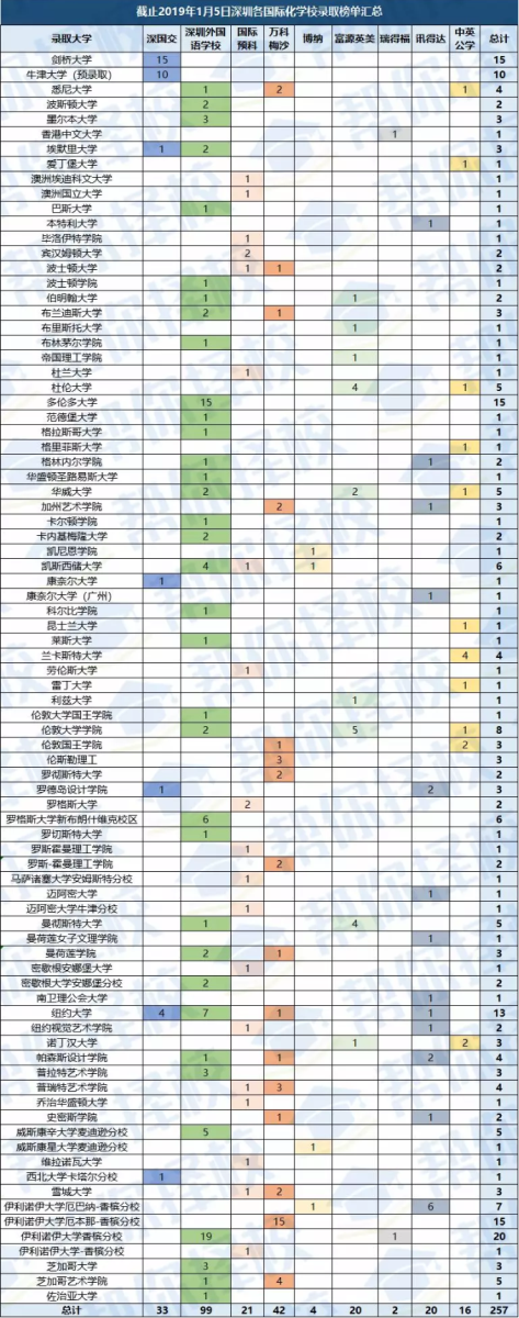 截止目前为止(2019年1月5日),深圳收到的录取名额总共是257个,分别是博纳收到4个,富源20个,国际预科21个,瑞得福2个,深国交33个,深圳外国语学校99个,万科梅沙42个,讯得达42个,中英公学16个。学校还在陆续放榜中,小编还未收集完全,有些学校还未收集到,小编会实时收集整理发布出来的!