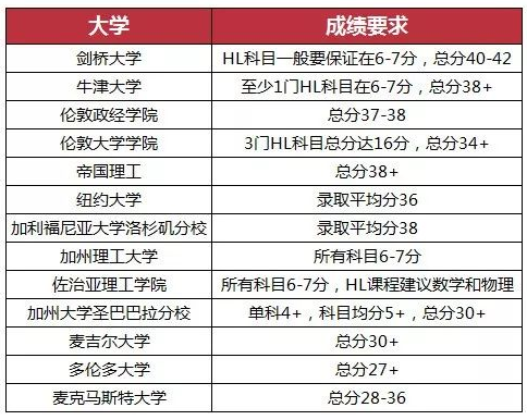 具体数据例如UCLA要求录取平均分为38+,加州理工要求所有科目在6—7分,佐治亚理工学员要求所有科目在6—7分、并且HL课程建议数学和物理,纽约大学录取平均分为36分。