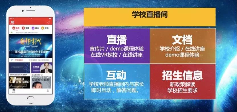 远播将线下展转为线上,打破时间和空间的约束,同时每个学校都有一个直播间,更全面地展示学校的特色,让学生家长了解每一所学校的特色。