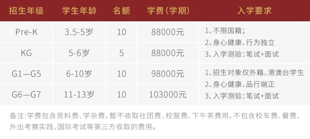 学费:K班:168000元/学年G1-G5:188000元/学年G6-G7:198000元/学年
