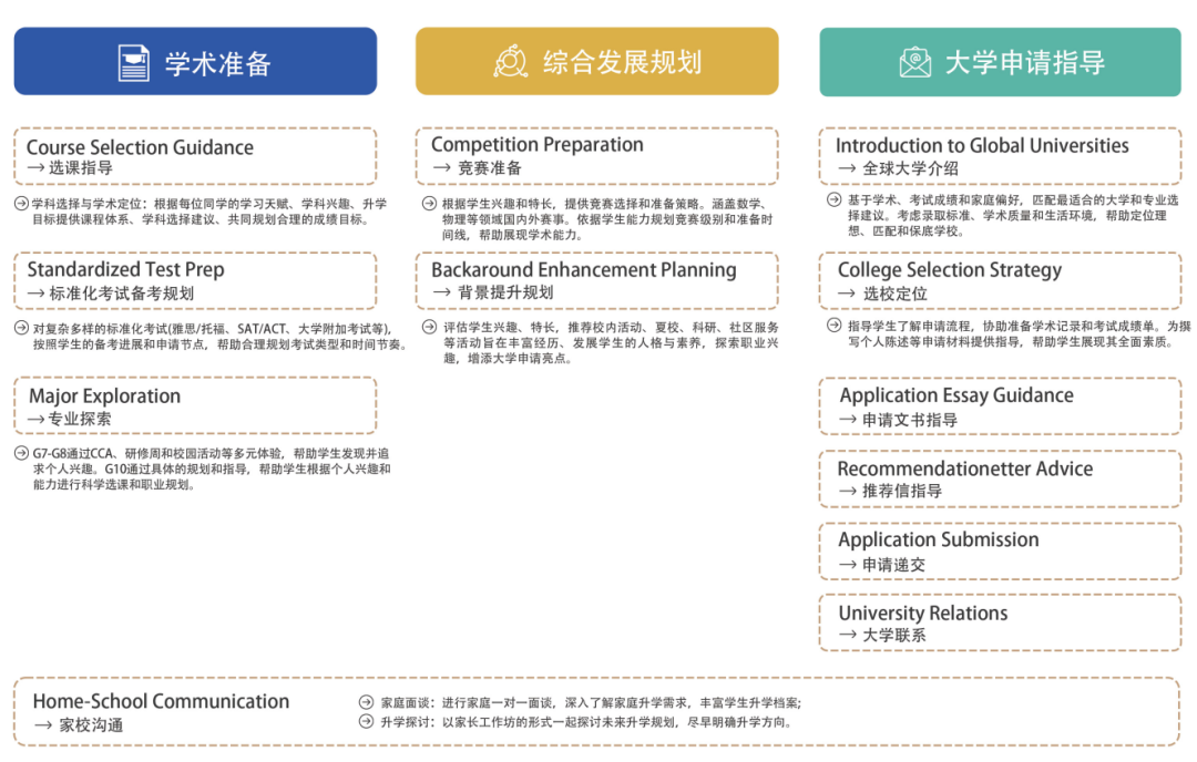 从学生入学开始,学校升学指导团队就秉承“以终为始”的理念,在每个关键升学节点为学生定制升学路径,覆盖选课、背景提升、文书指导、面试辅导等,确保每位有着不同兴趣和个性的学生都能够一步步完善自己的目标。