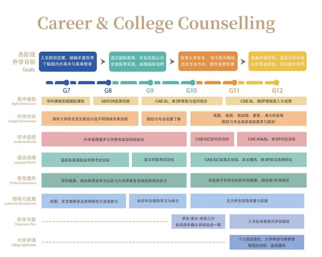从选课规划到大学申请,全程介入,如在G10正式选科前,不仅会结合学生学习成绩、人格测试、兴趣测评给予选课程、选科的建议,还会与学生和家长组织多次面谈、国际课程科普工作坊,并设置一段课程适应期,确保学生清晰认知自己的学科适配度。