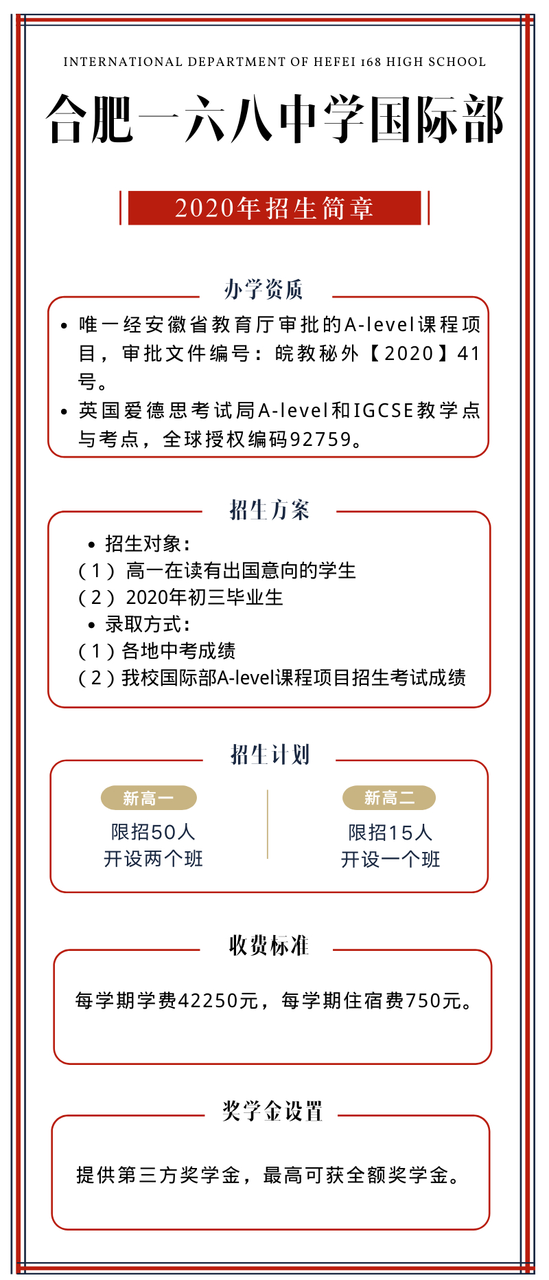 400-9609-559合肥一六八中学国际部创建于2020年,该校引进了英国A-LEVEL课程项目,设立A-LEVEL课程教学和考试中心、选课与学生生涯规划指导中心,帮助学生拓宽升学渠道,为学生提供更多的成长空间和未来更多可选择的机会。英国爱德思考试局A-level和IGCES教学点与考点,全球授权编码92759。