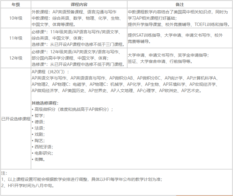 华附国际部全称为华南师范大学附属中学国际部,此前系2004年广东省教育厅批准成立的华师附中国际基础课程中心,于2009年初正式更名为华南师范大学附属中学国际部,简称为HFI。学校主要以AP课程为主,课程设置如下: