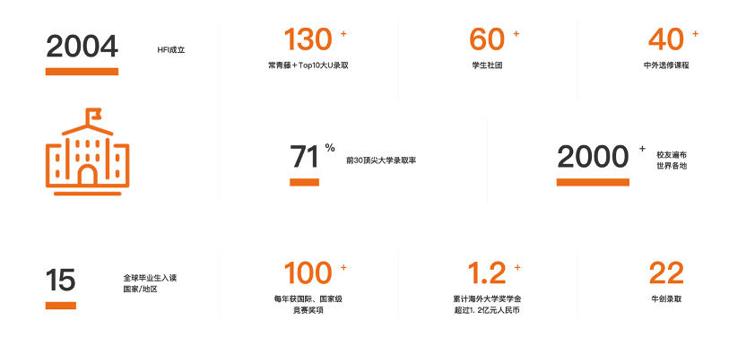 经过多年有序的办学实践,HFI已培养出超过2000名毕业生(含IFY英澳预科项目),毕业生遍布全球15个国家和地区。同时,作为华南区第一所引进AP课程的高中,HFI一直保持着高标准的办学目标,历届毕业生: