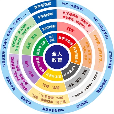 在严格落实教育部、安徽省九年制义务教育课程安排的前提下,融合国际通行课程的先进教育理念和课程元素,在六个学习领域实施三类课程。