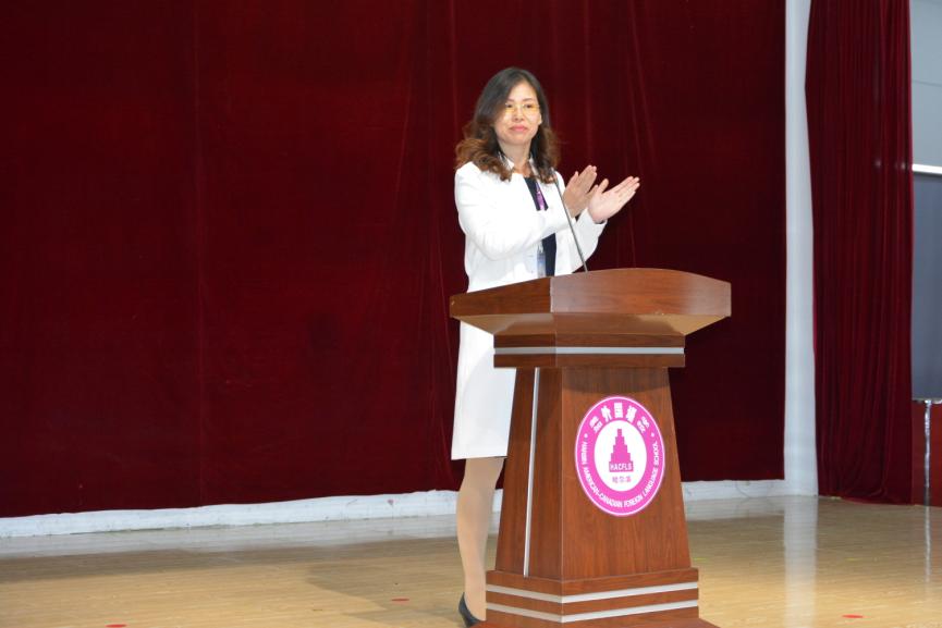 最后,学校常务副校长兼国际部校长张丽润为全体教师送上了新学期寄语。首先,张校长对国际部的新学生表示了热烈的欢迎,并且肯定了去年国际部取得的优异成绩。国际部的规模在不断地壮大,第二届学子以72%的世界名校录取率再攀新高。2017年是学校发展的最关键一年,学校各项工作顺利完成了预定目标,教育教学取得了可喜的成绩;中加项目完成双百目标,中澳项目成功启动。所有成绩的取得都是全校师生和同学努力拼搏的结果,张丽润校长对学校取得的优异成绩表示了衷心祝贺。
