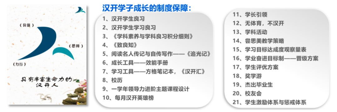 导师制,寄宿制,积分制,小班化,汉开文凭制,月度汉开英雄评选,汉开年度人物评选等多种方式培育学生健全人格,磨炼学生意志品质。