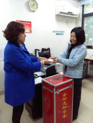 在我校关工委老师的倡导下, 2015年成立了“金阳光助学基金”,离退休老教师积极为学校的困难学生捐款。有退休教师携小孙子来捐赠压岁钱的,有退休教师为生活困难的学生饭卡充值。