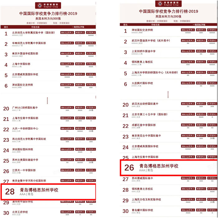 “2019年中国国际学校竞争力排行榜”博格思美国本科升学位于全国第28位,山东第一! 在2019年中国国际学校竞争力排行榜中,博格思学校从全国1257所国际学校中脱颖而出,师资竞争力排名全国第5名,美国本科方向全国综合排名第28,英国本科方向全国综合排名第26名,升学竞争力排名全国第77名,升学竞争力排名第165名。整体排名位居山东省国际学校第一名。