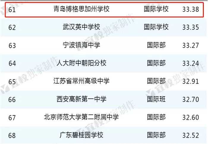 “宜校2020中国最强中学榜国际高中权威排名”博格思排名山东第四! 在最新发布的“宜校网2020中国最强中学榜国际高中权威排名”中博格思学校获青岛第一,山东第四(前三名均为公办学校),全国61名,排名较上一年的同类排名上升了5名!