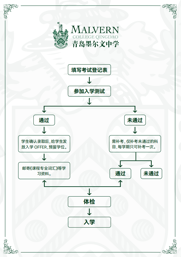 携带学生本人身份证件,参加由青岛墨尔文中学的统一入学测评,包括:英语机考、数学笔试、口语面试及家长面试。