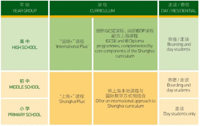 校提供从小学一年级至高中十二年一贯制教育,融合了中国及国际先进的课程元素。1-8年级采用上海课程,9-12年级采用剑桥IGCSE、国际IBDP课程,以及中国文化课程。