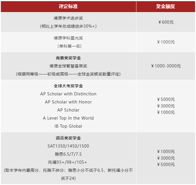 2024-2025学年燎原双语复兴百万奖学金计划启动!入学奖、学术奖最高可学费全免,复兴升学奖百万奖金助力学子冲击牛剑藤校,另有竞赛、进步、语言、全球大考等单项奖金,全方位激励燎原学子不断进取,获得成就。