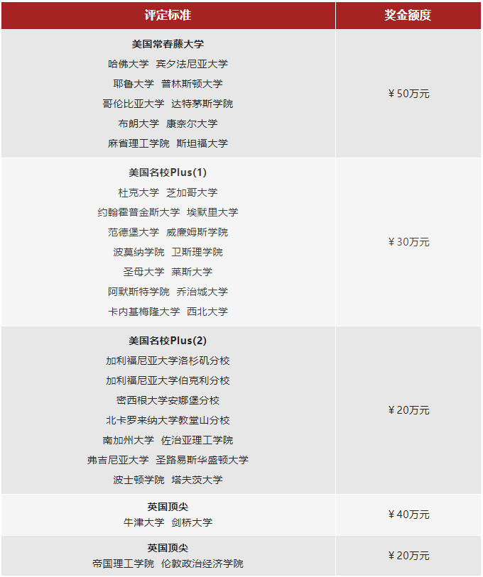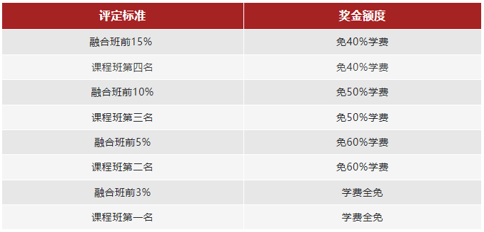 注:本条款适用于入学的第一年,接下来的奖学金按照其学生成绩在全年级百分比比例来发放,具体请参考以下‘学术奖’。