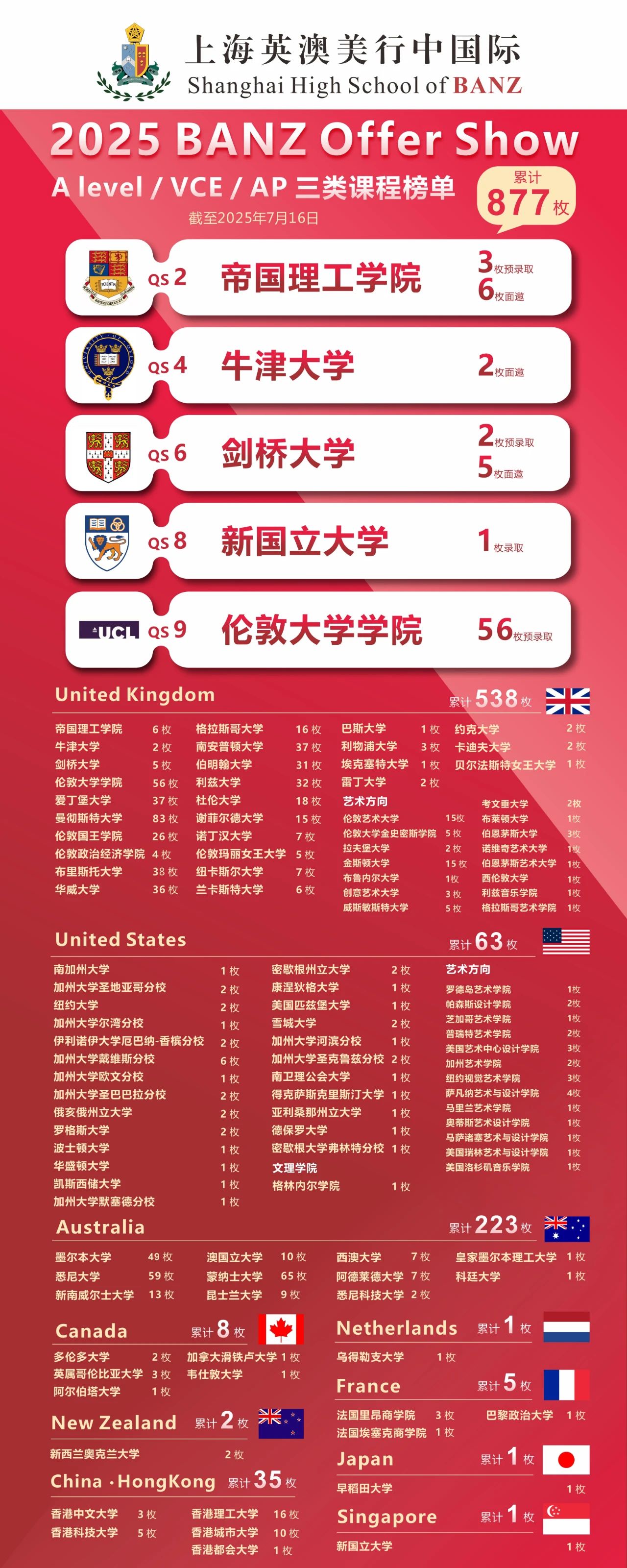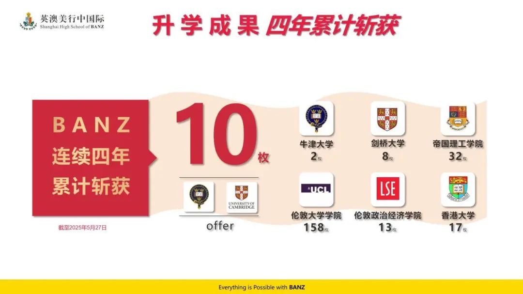 上海英澳美行中国际办学9年,连续4年共斩获10枚牛剑offer,学生申请到英国G5、美国公立藤校、澳八大名校的不在少数,专业也非常多元,就业情况非常亮眼,不少进入世界500强或继续深造。
