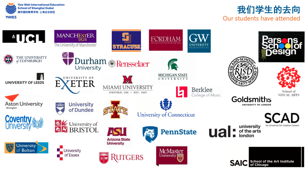 录取包括伦敦艺术大学、帕森斯设计学院、普瑞特艺术学院、格拉斯哥艺术学院、艺术中心设计学院、纽约视觉艺术学院、萨凡纳艺术与设计学院、伯克利音乐学院等。