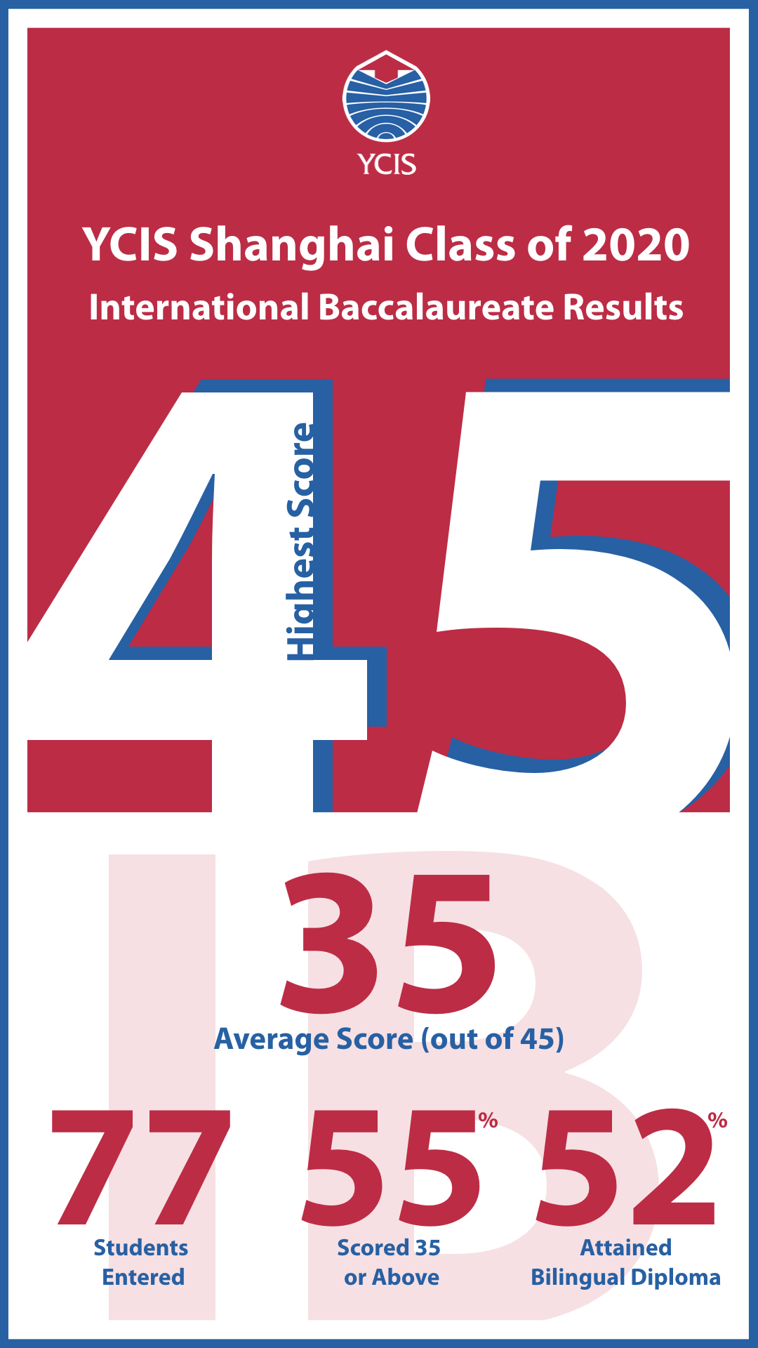 上海耀中2020届学生在今年的国际文凭课程(IBDP)考试中取得了令人骄傲的成绩。我们的毕业生们取得了35分的平均分(总分45分),比世界平均分29.9分高出了5分。与此同时,52%的毕业生获得了双语文凭,这个数字比前两年(2018年为47%,2019年为51%)又有了进一步的增长,也充分体现了上海耀中中文课程的优势。