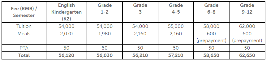 英文部费用请见下表(每学期)。所有金额均为人民币