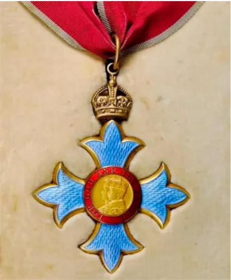 注:大英帝国勋章共设5种级别,分别为:爵级大十字勋章 (男女皆简称GBE),爵级司令勋章(男性简称KBE,女性简称DBE),司令勋章 (简称CBE),官佐勋章 (简称OBE),员佐勋章 (简称MBE)。知名J•K•罗琳、大卫-贝克汉姆夫妇也曾被英国女王伊丽莎白授予OBE勋章。