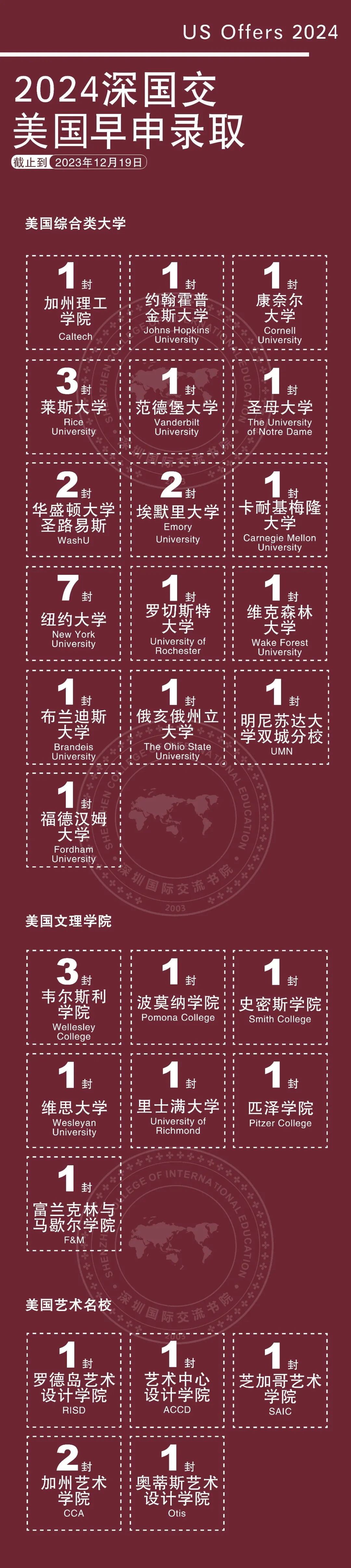 随着寒假渐近,2023年已近尾声。冬日的风刚刚见证了热闹的圣诞音乐会,又为深国交毕业生们吹来了好消息。截至2023年12月19日,深国交2024届毕业生已经收到了不少美国早申阶段(ED/REA/EA)录取通知书。