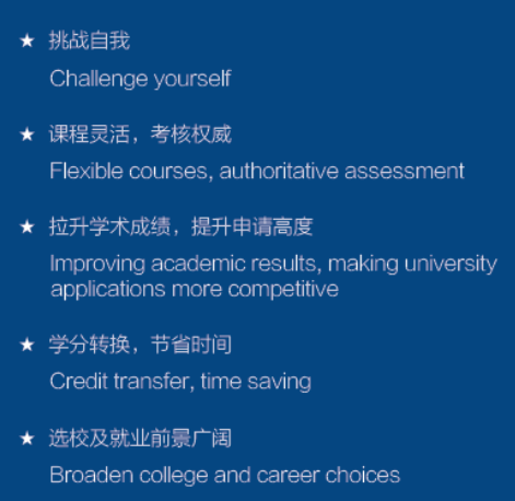 美国大学先修课程(AdvancedPlacement,简称AP)是由美国大学理事会College Board 在高中阶段开设具有大学水平的课程。在美国本土广泛开设,全球认可。它帮助学生更快适应大学的学术挑战,积累大学学分,取得学业成功。很多顶尖大学已将AP成绩看作衡量学生学习和研究能力,以及应对高难度大学课程能力的重要指标。