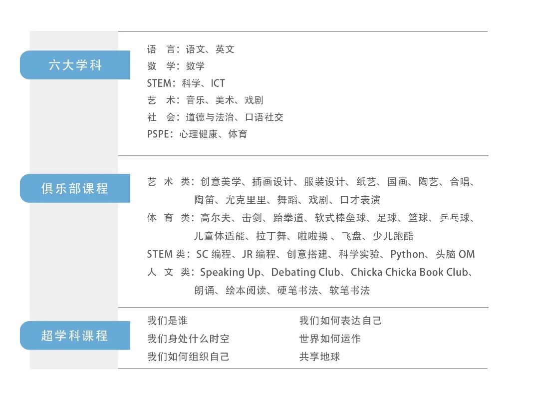 我校PYP设置语言、学科、活动三大核心板块,不仅注重基础知识和能力的训练,更注重培养孩子全面均衡发展的能力。同时,我校开发不同形式的校本课程,带领学生进行文化交流、发展艺术欣赏的态度;锻炼学生体魄及综合素养;旨在培养学生成为合格的国际公民。