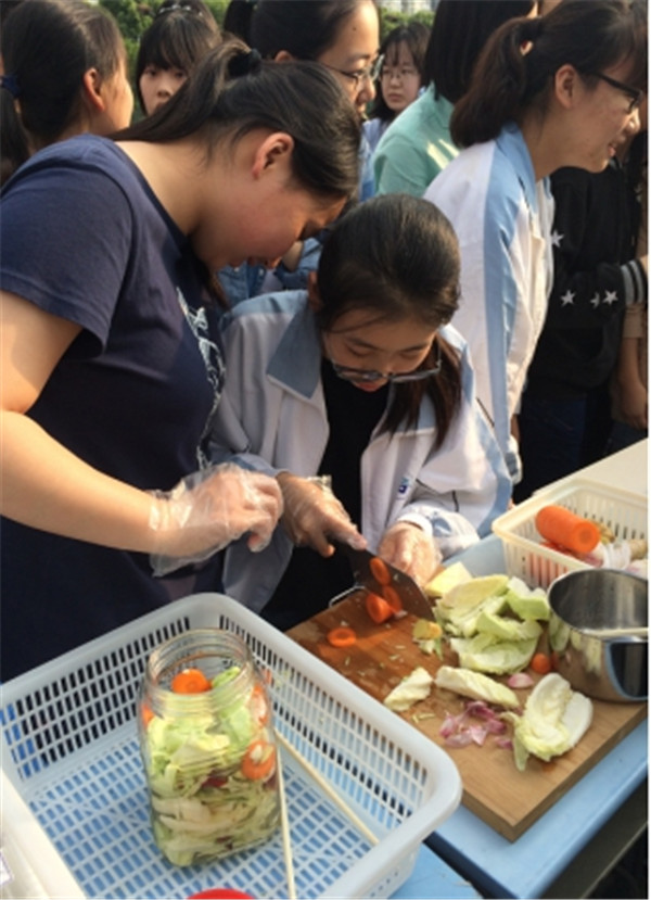 泡菜组的同学们则分成三组在现场进行了三种不同蔬菜搭配的泡菜制作,从洗菜切菜,到搭配配料,到最后进行腌制,同学们都互相配合,亲力亲为,做完之后同学们都表示对他们做的泡菜很有信心,腌制完成后要第一个品尝。