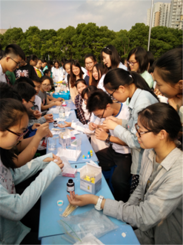 生物组共设置了两个探究活动:ABO血型的检测和泡菜的制作。探究小组的成员们一到现场就被踊跃的同学们围住了,由14个同学组成的血型检测组吸引了大量好奇的同学们前来测验血型,小组成员们熟练、规范的操作手法,让同学们对这些“小医生”们刮目相看。王晨宇同学表示:“能够有机会将书本上的知识应用起来,为同学们测验出血型,非常地开心!”探究小组的成员们虽然来自于不同的班级,但是大家的配合相当得默契。