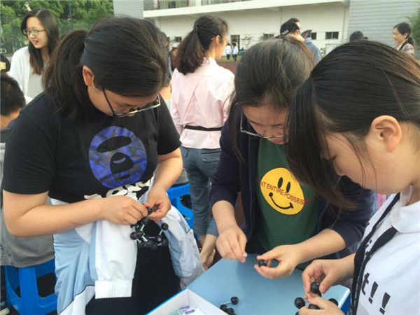 化学科技探究活动共设三个环节,来自高一(8)班的同学操作熟练、配合默契,仅用了三分半钟便顺利完成足球烯和金刚石模型的搭建,并使用自己组装出的水果电池成功使音乐贺卡响起,成为全场最快完成的组合。在师生们的加油鼓劲下,全部12个参赛组合都顺利完成了比赛。