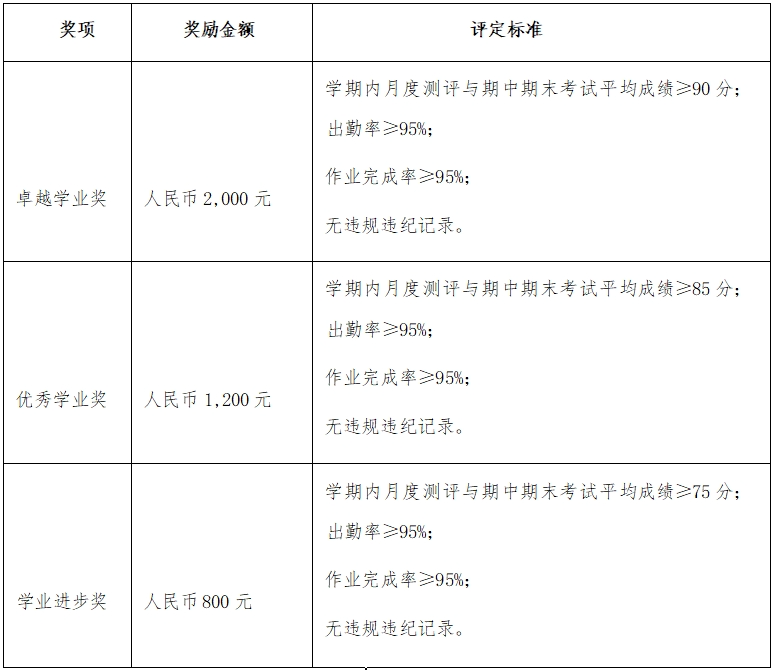 卓越菁英奖:中考成绩达到当地市重点高中录取分数线及以上者,享受首年学费全免。