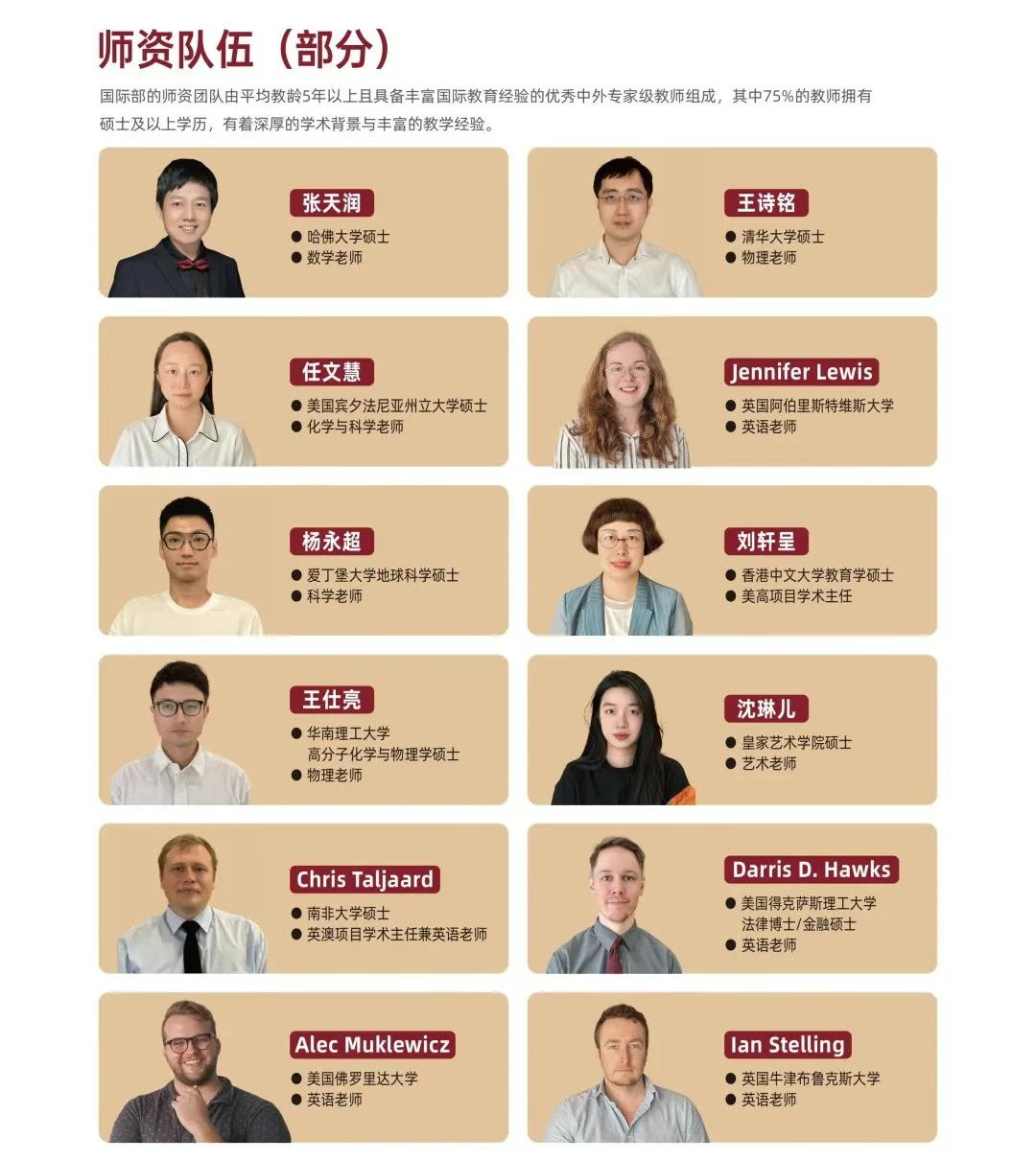 在十余年的发展历程中,国际部已经形成了一支高素质的教学、管理和服务的中外籍师资团队,师资团队由平均教龄5年以上且具备丰富国际教育经验的优秀中外专家级教师组成。