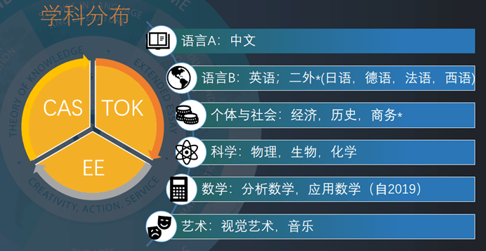 IB课程:除了母语(中文)文学课程、核心课程知识论和中国高中课程外,其他均用英语原版教材进行全英语授课。